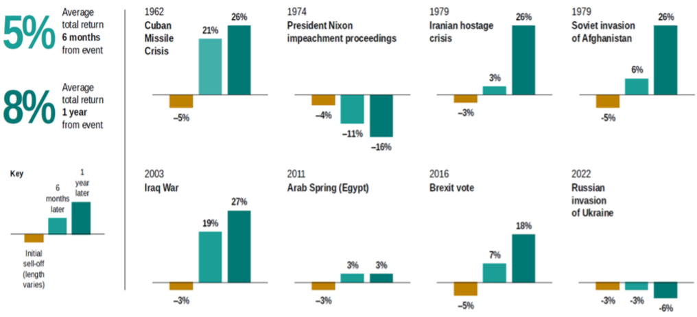 8% is the average one-year total return for the U.S. stock market following the onset of geopolitical events. Investors who choose to “do something” by selling stocks in response to such events tend to miss out on the market’s recovery and future growth.