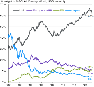 If these geographic performance trends build further over the coming quarters and years, they will impact the makeup of the global stock market. We can see this dynamic playing out in Exhibit 3, which represents the global stock market share for select countries and regions. First, in looking at the U.S. share of the global stock market (i.e., its overall value relative to other regions), we see that for some time now, the U.S. has had and continues to enjoy the top spot in terms of size of collective stock market wealth relative to the rest of the world. But that hasn’t always been the case. Japan, as recently as the early 1990s, represented the bulk of the world’s stock market wealth. However, investors who were certain that Japan would remain the dominant driver of global market returns were sure to be disappointed over the next few decades, as the country's market performance waned even as other countries and regions accelerated. Relating this historical trend to today, it’s important to keep geographic diversification in mind when investing. While we have no way of knowing which country or region will outperform over the next few decades, exposure to the global market helps ensure that investors can benefit from global stock market returns, no matter where they come from.