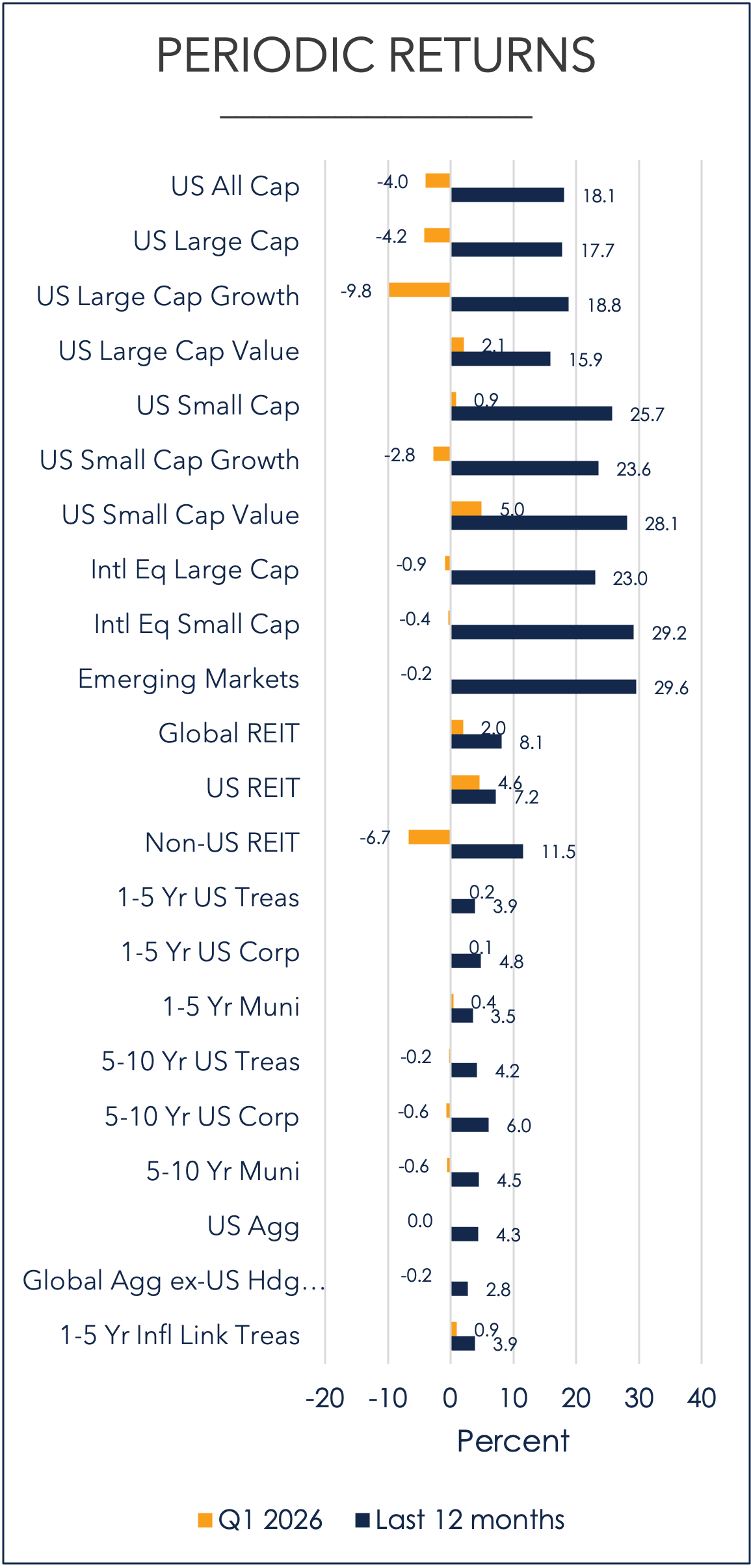 Uncertainty in today’s markets stretches beyond geopolitical conflict and oil prices. Dating back to late last year, artificial intelligence companies have come under the market’s broader scrutiny, namely those in the Magnificent 7, a group of high-flying tech stocks represented by Microsoft, Tesla, Meta, Amazon, Apple, Google (Alphabet), and Nvidia. However, the group garnered a new catchy, albeit less flattering, nickname —the “Hateful 8” — when it welcomed a new member company, Oracle, to the group. The trend that began in Q4 2025, when five of the seven companies underperformed the S&P 500 index, has continued into 2026 and worsened, with all of the Hateful 8 companies losing value this year. Microsoft and newcomer Oracle each lost more than 20% this quarter. For context, the S&P 500 lost 4.3% in Q1, of which Microsoft was responsible for about one-quarter of the index’s overall loss. This highlights the importance of diversification in investor portfolios and of not taking undue company-specific or sector risks.