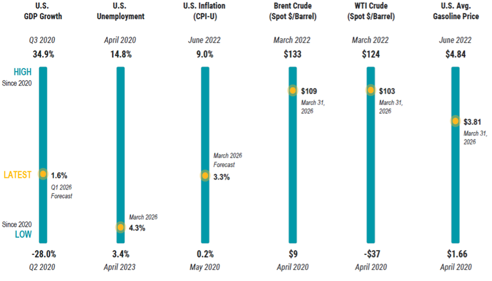 Data from 1/1/2020– 3/31/2026. GDP Source: U.S. Bureau of Economic Analysis (BEA) and the Federal Reserve Bank of Atlanta’s GDPNow.