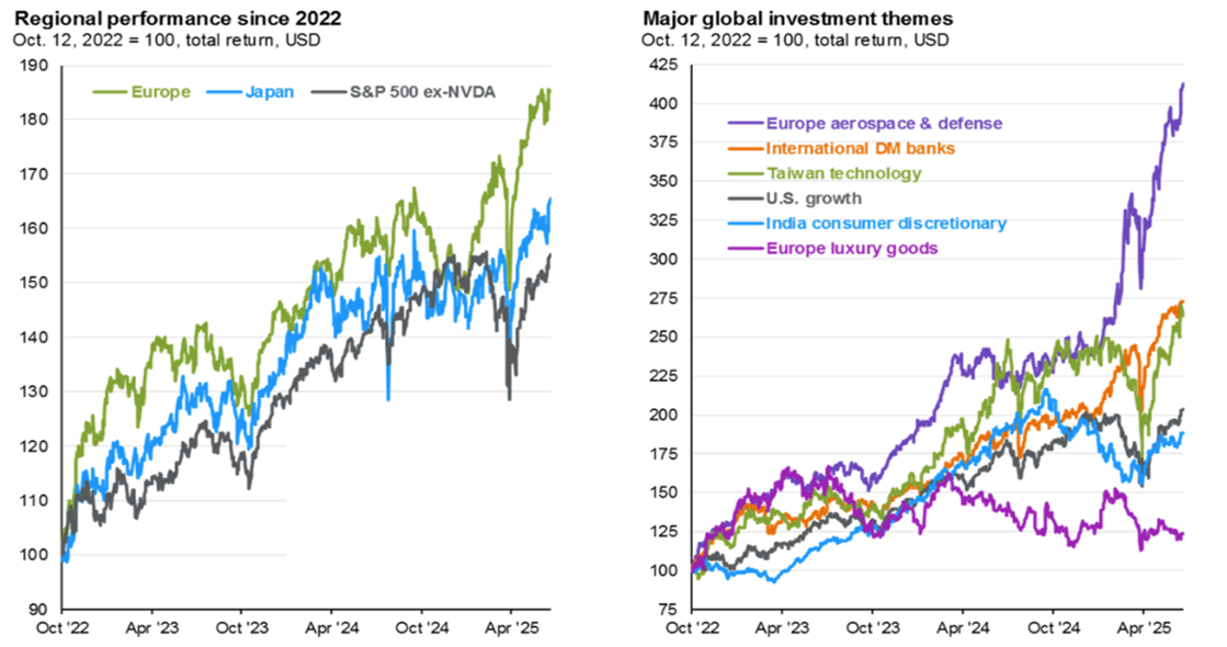 These charts display international stock performance by region and sector relative to different measures of U.S. stock performance. Beginning with the chart on the left, European and Japanese stocks have outperformed U.S. stocks when excluding Nvidia. Similarly, in the chart on the right, a few regional sectors have outperformed U.S. large-cap growth companies. European aerospace and defense companies, international banks, and Taiwanese technology companies have all benefited from recent market trends during the prior two years or more. This highlights the benefits of broad diversification by geographical regions and sectors.