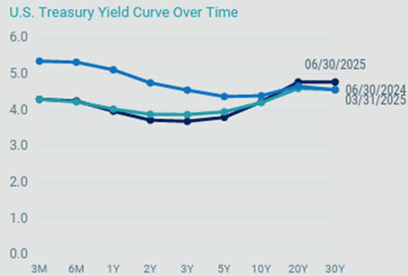 In addition to making things difficult for businesses and consumers, tariff uncertainty can also complicate things for the Federal Reserve. So far, it’s possible that we haven’t seen the full effect of tariffs flow through to prices and inflation. The Fed’s preferred measure of inflation, the Core Personal Consumption Expenditures Index (or Core PCE), continues to hover below 3% (2.7% as of May 2025), and the unemployment rate sits near all-time lows. Given that both components of the Fed’s dual mandate of maintaining low unemployment and stable prices are below their trailing 60-year averages (5.9% unemployment and 3.2% Core PCE), it’s unlikely that the Fed will begin to cut rates quickly, even if markets expect rate cuts to resume by year’s end. For now, it remains a wait-and-see approach for the Fed.