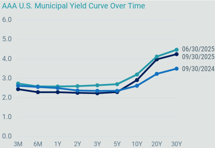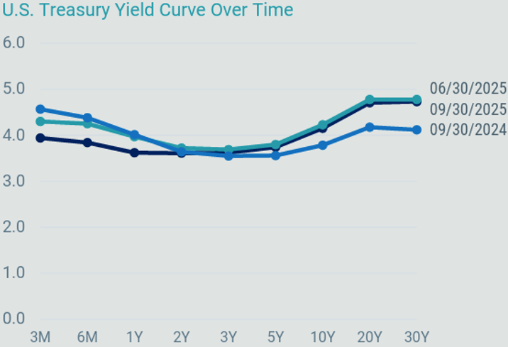 Focusing on recent Treasury yield curve changes in Exhibit 4, compared to last quarter-end, short term rates, which the Fed controls, fell over the quarter, while longer-term yields remained largely unchanged. You can also see that the shorter portion of the curve is still flat-to-inverted but begins to steepen on the longer end. Short-term yields dropped while intermediate- and longer-term yields rose over the 12 months ending September 30, hence the positive relative performance previously mentioned.