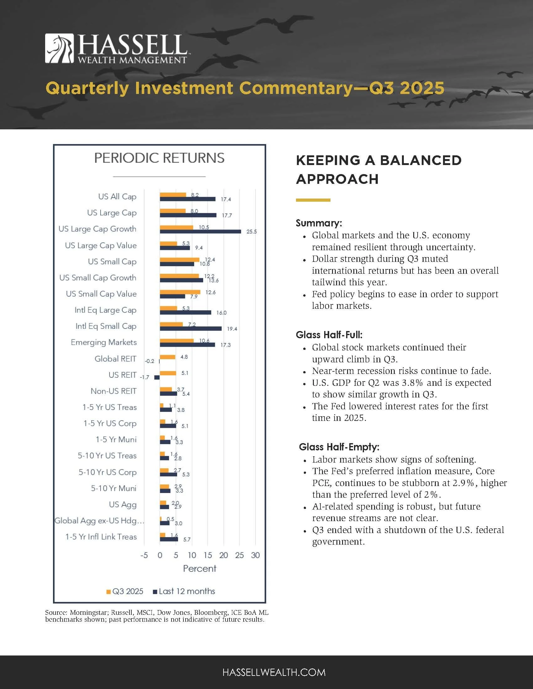 U.S. stocks were positive for Q3 gaining 8.2% fueled in part by a small-cap stock rally. Small-cap value stocks gained the most at 12.6%.
