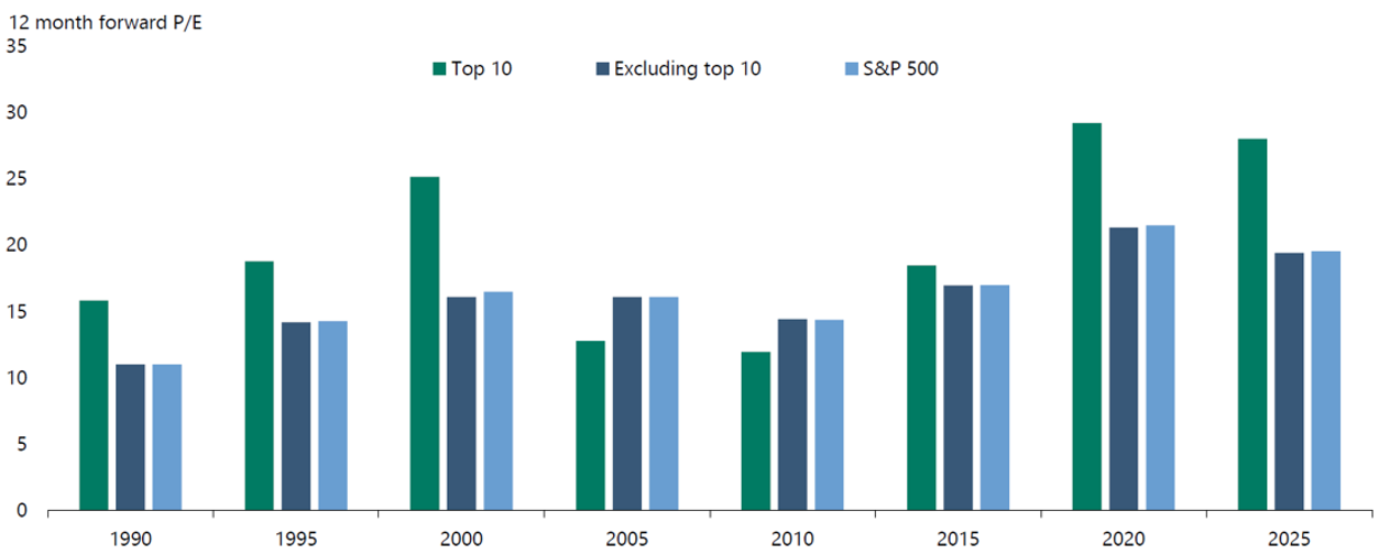 Exhibit 3 shows that today’s top 10 S&P 500 companies are more expensive, based on the 12-month forward P/E ratio, than the top 10 were in the late 1990s and early 2000s before the internet bubble burst. The same is true for the index more broadly. Just like the AI revolution of the 2020s, the internet revolution of the 1990s touted generational change, and in hindsight, it's fair to say that the internet delivered on its promises. While the future is unknowable, the same might be true for AI, and it's also not unreasonable to expect that it could happen with the same fall-back-to-earth dynamic as when the internet bubble burst.