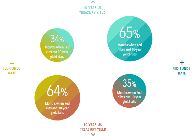 Source: Dimensional Fund Advisors, Federal Reserve Economic Data (FRED) from the Federal Reserve Bank of St. Louis. Data series used: Market Yield on US Treasury Securities at 10-Year Constant Maturity, Quoted on an Investment Basis, Percent, Daily, Not Seasonally Adjusted (DGS10); Federal Funds Target Rate (DISCONTINUED), Percent, Daily, Not Seasonally Adjusted (DFEDTAR); and Federal Funds Target Range - Upper Limit, Percent, Daily, Not Seasonally Adjusted (DFEDTARU). Circles corresponding to a rate cut do not sum to 100% due to monthly periods of no yield change for the 10-Year US Treasury note.