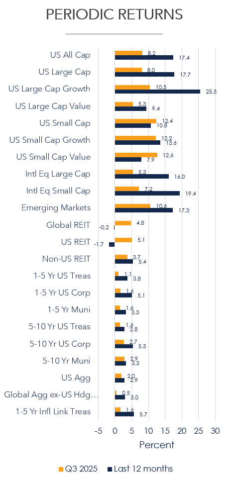 Developed and emerging non-U.S. stock market returns were all positive for Q3 and all periods during the past 12 months.
